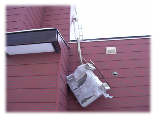 大手電器店でエアコンを購入・取付をしてもらったそうですが、下屋根の上に木材を敷きその上に室外機を設置する工事だった為に、木材が腐食し、先日の強風で室外機が屋根より滑り落ちてしまいました。